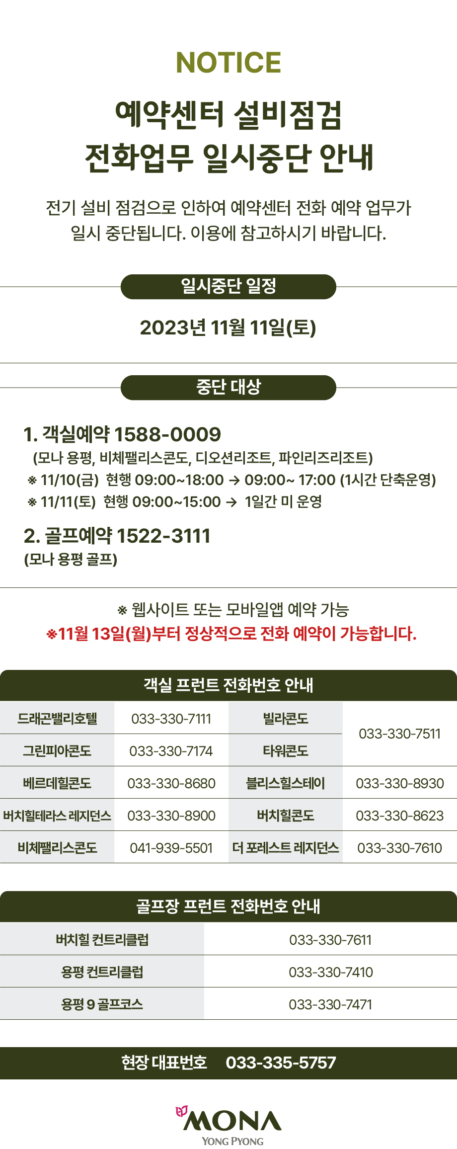 설비점검으로 인한 예약센터 전화업무 일시중단 안내(11/11)