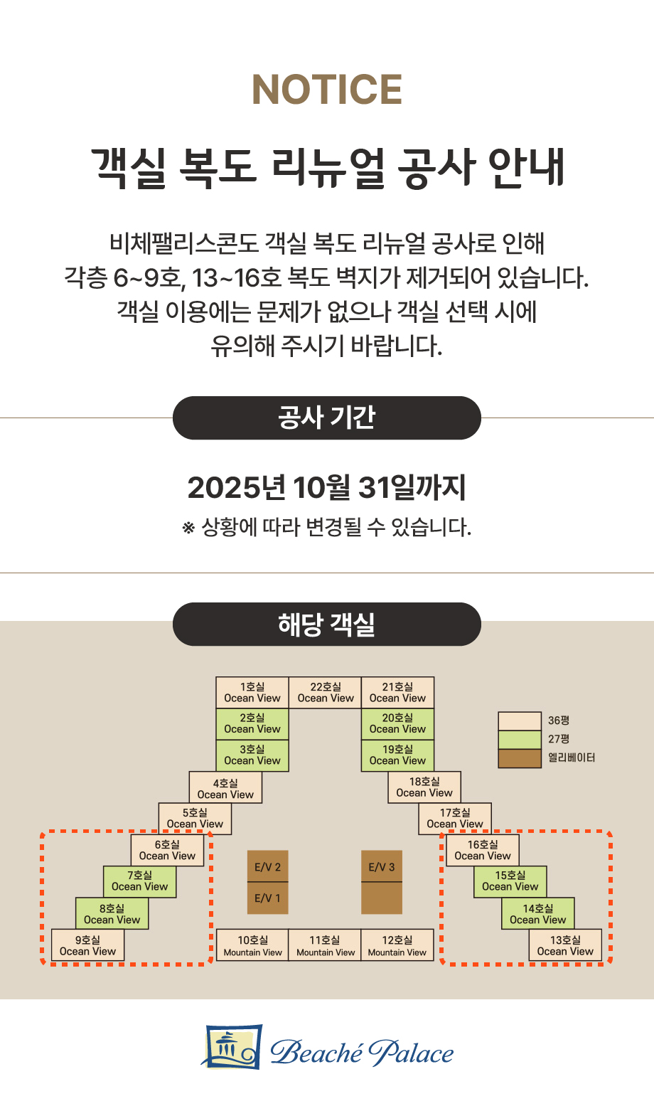 객실 복도 리뉴얼 공사 안내(~10/31)